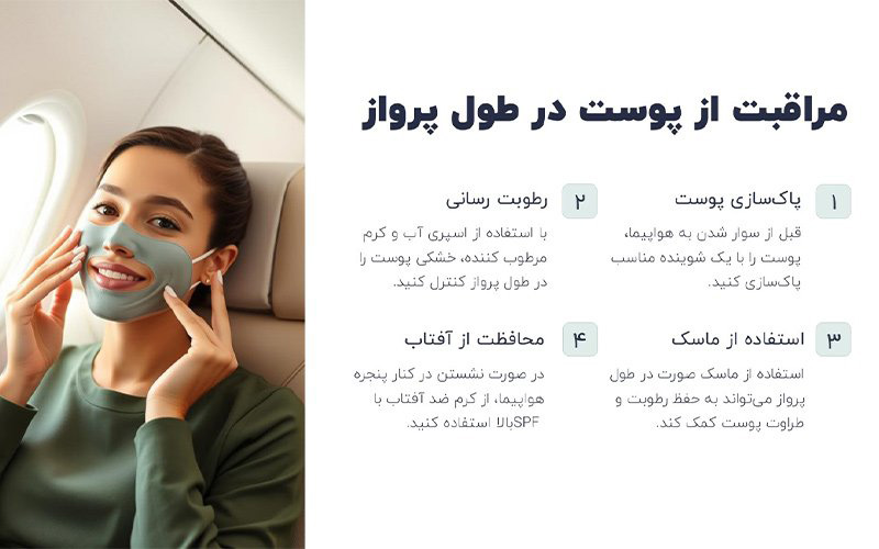 - قبل از پرواز: پوست را تمیز کرده و یک مرطوبکننده غنی یا ماسک شبانه بزنید.